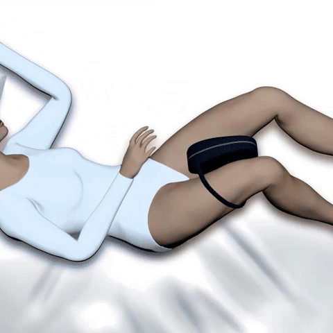 Lie or sit down and slide the pillow onto your preferred leg by putting your foot through the elastic strap.